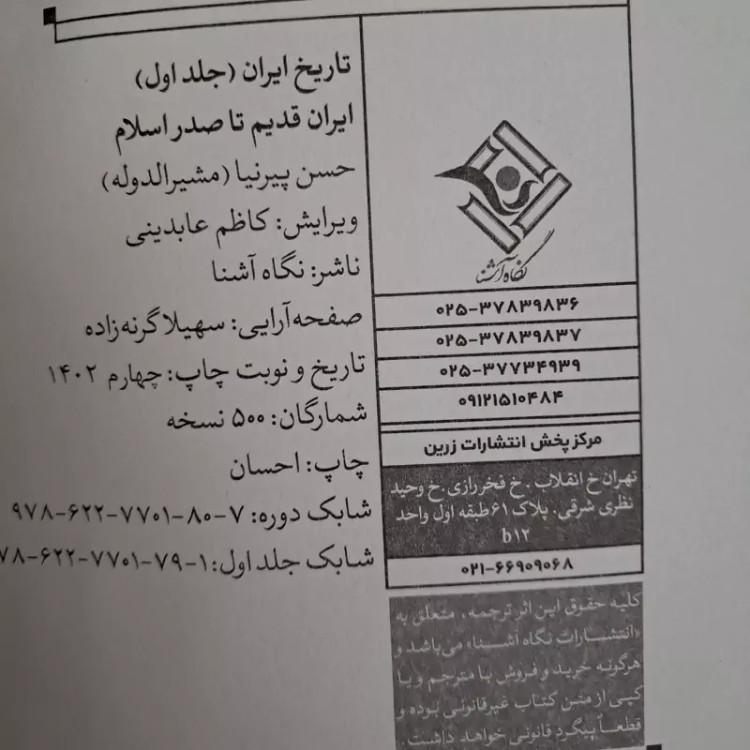 تاریخ کامل ایران حسن پیرنیا انتشارات نگاه آشنا 4 جلدی قابدار قیمت روی جلد 1650 کاغذ سبک